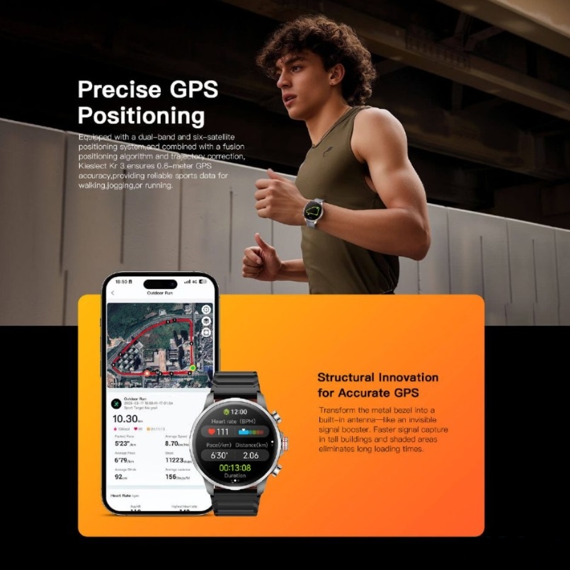Nhờ hệ thống định vị 2 băng tần, 6 vệ tinh và thuật toán tối ưu. Đồng hồ Kieslect Kr 3 cung cấp GPS chính xác 0.6 mét, mang lại dữ liệu thể thao tin cậy cho việc đi bộ. Chạy bộ hoặc chạy. Viền kim loại tích hợp ăng-ten giúp bắt sóng nhanh hơn, loại bỏ thời gian chờ ngay cả ở khu vực bị che khuất.