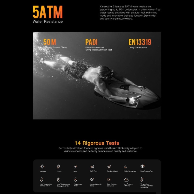 Đồng hồ đeo tay thông minh Kieslect Kr 3 có khả năng kháng nước 5ATM. Hỗ trợ hoạt động dưới nước ở độ sâu lên đến 50m. Chế độ bơi tự động khóa thông minh để tránh chạm cảm ứng ngoài ý muốn khi ở dưới nước. Cùng chức năng thoát nước tiên tiến giúp làm sạch loa và đảm bảo hoạt động ổn định sau khi tiếp xúc với nước.