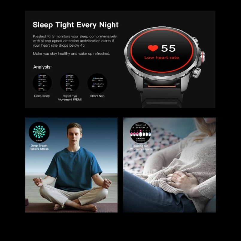 Để quản lý sức khỏe toàn diện, nhà sản xuất sử dụng module đa kênh, thuật toán tiên tiến, kết hợp cảm biến quang học để theo dõi chính xác nhịp tim, SpO2, chất lượng giấc ngủ, mức độ căng thẳng. Đồng hồ đeo tay Kieslect Kr 3 cũng phát hiện sớm các thay đổi bất thường trong cơ thể, giúp ngăn ngừa rủi ro sức khỏe kịp thời. Tính năng phát hiện ngưng thở khi ngủ, cảnh báo rung nếu nhịp tim giảm xuống dưới 45.