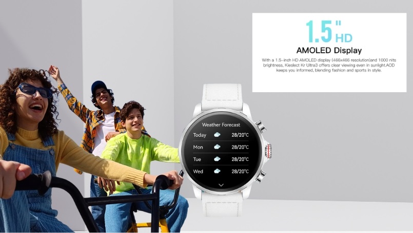 Đồng hồ Kieslect Kr Ultra 3 sở hữu màn hình HD AMOLED 1.5 inch, độ phân giải 466×466 và độ sáng 1000 nit, mang đến khả năng hiển thị cực rõ nét ngay cả khi ở ngoài trời nắng gắt. Tính năng AOD – Always-On Display để xem giờ và các thông báo quan trọng ngay lập tức mà không cần phải bật sáng màn hình.
