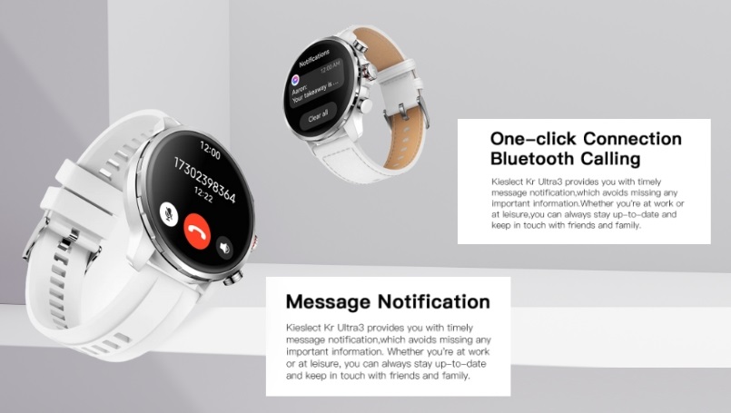 Đồng hồ cho phép kết nối và thực hiện cuộc gọi qua Bluetooth dễ dàng chỉ với một lần nhấn. Kr Ultra 3 White cũng hiển thị thông báo tin nhắn kịp thời, đảm bảo không bỏ lỡ bất kỳ thông tin quan trọng nào. Ngoài ra, người dùng hoàn toàn có thể điều khiển nhạc trong lúc tập luyện qua Bluetooth mà không cần đến điện thoại.