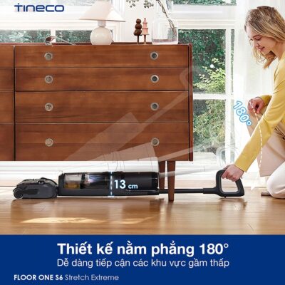 Máy hút bụi lau sàn Tineco FLOOR ONE S6 Stretch Extreme. Được trang bị công nghệ Tineco HyperStretch độc quyền. Cho phép máy nằm phẳng 180° với chiều cao chỉ 13cm. Thiết kế này giúp bạn dễ dàng làm sạch sâu các khu vực khó tiếp cận. Gầm thấp của nội thất mà không hề ảnh hưởng đến hiệu suất hoạt động.